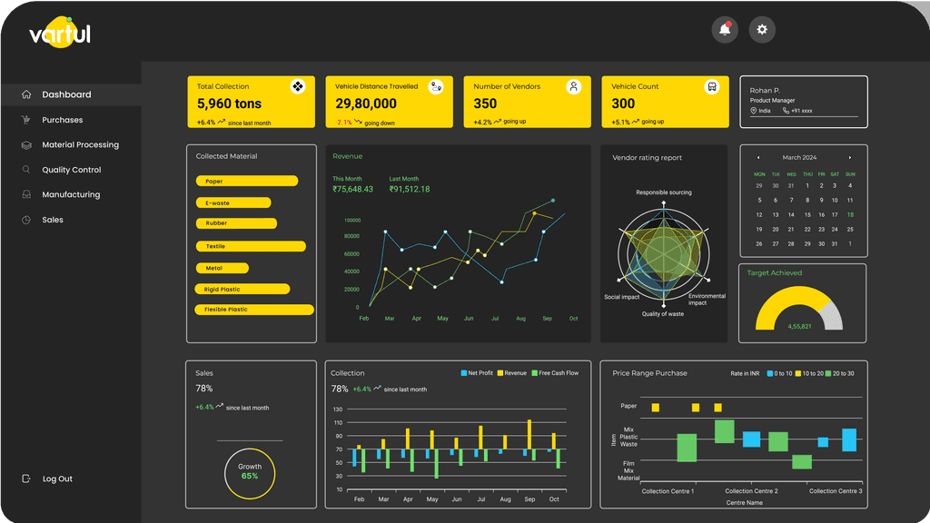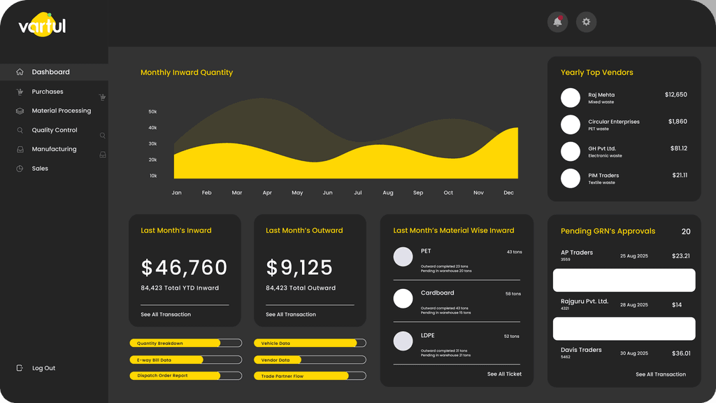 From one site to fifty, Vartul unifies operations across warehouses and facilities. Manage inventory, vendors, material flows, and job work through live, multi-site dashboards—customizable for complete visibility of your operations at every stage.